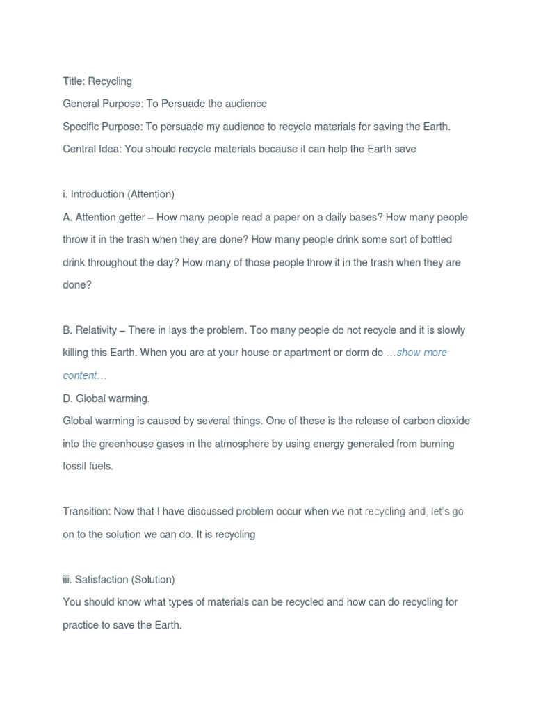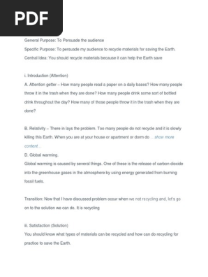 Monroes Motivated Sequence Template. Most of the claims are supported by. Recycling has become necessary because landfills are rapidly being closed and are causing increasingly more damage to the environment.